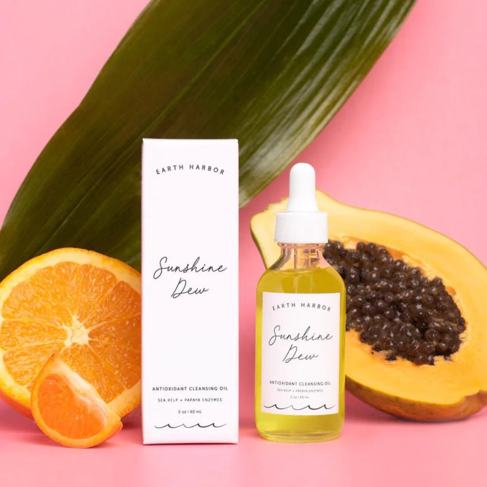 Sweet tropical sunshine with silky dew drops sail smoothly across your face removing impurities, pollution, and makeup. Antioxidant-rich oils infused with Sea Kelp + Papaya Enzymes will arouse your senses while profoundly cleansing and softening your complexion. Sunshine Dew rinses completely clean with water; no tugging, scrubbing, nor greasy feeling. Just an effortless oil massage & rinse leaving skin fresh, soft, hydrated, and bright.